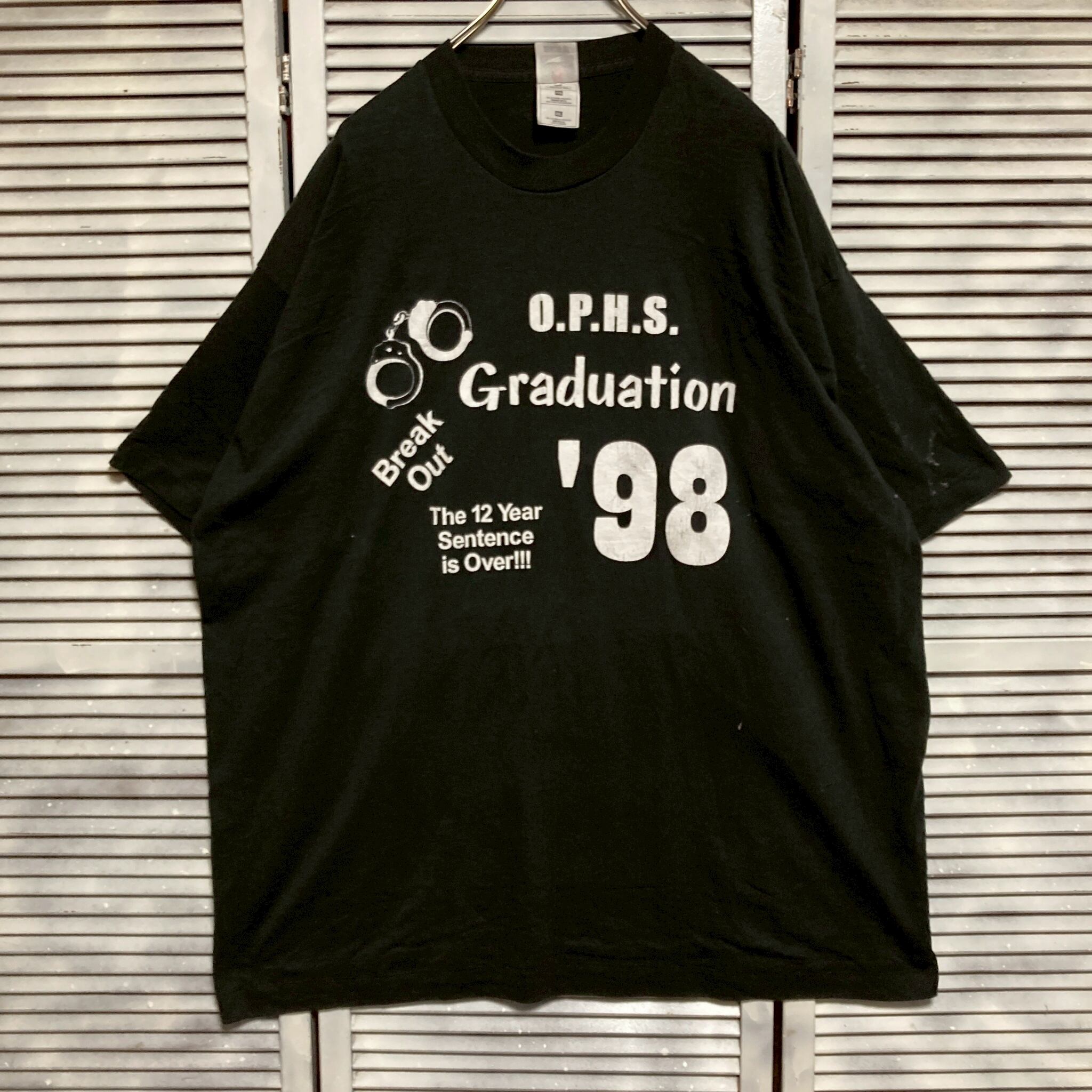 ネタ Tシャツ ビンテージ 古着 90s USA製 黒 刑務所 脱獄 出所 記念 手錠 1998