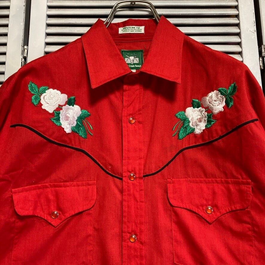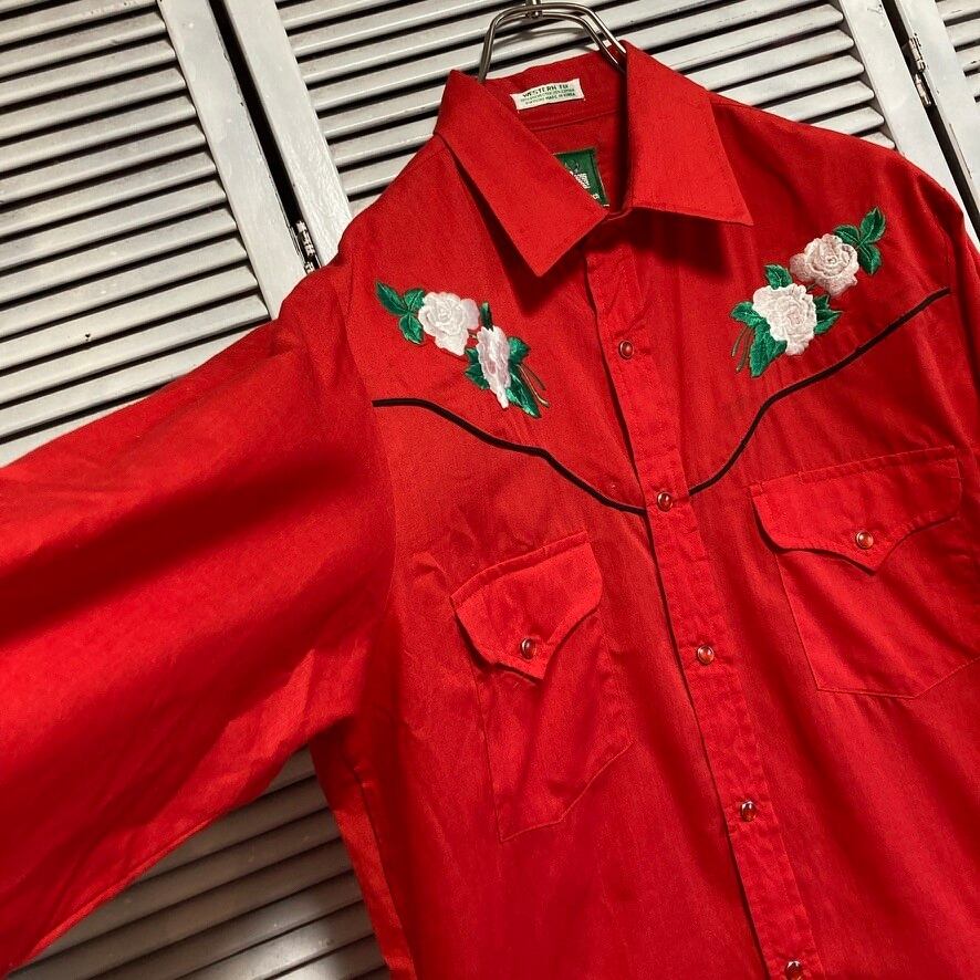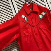ウェスタン シャツ 長袖 ビンテージ 古着 90s 赤 花柄 刺繍 ヨーク パール スナップ ボタン